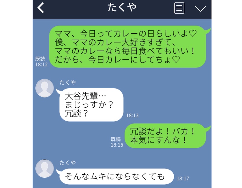 いつもは「俺」「おふくろ」なんて言っていたのですが、「僕」「ママ」と呼んでいることがバレてしまっていますね……。後輩に突っ込まれてムキになってしまったのも失敗でした。この日から一転、いじられキャラになってしまった先輩……。過去には戻れないけれど、できることなら消し去りたい黒歴史でした。