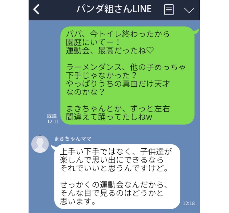こちらは、とある保育園のクラスLINE。ここで大誤爆をやらかしてしまったこちらのママ。この日は保育園の運動会があり、夫と待ち合わせの連絡がてら「ほかの子めっちゃ下手、うちの子だけ天才」という、親バカ性悪LINEを送ってしまったのです。