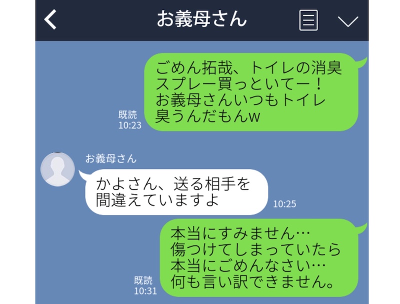 こちらの誤爆も、顔が青ざめてしまいそうな内容です。夫に送ったはずの「お義母さんいつもトイレ臭うから、消臭スプレー買ってきて!」というLINEを、まさかの本人に送ってしまいました。