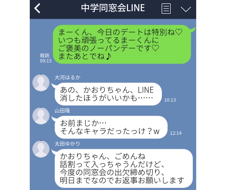 こちらは、かなりキツい内容になっています……。久しぶりに中学の同窓会をやろうとグループLINEを立ち上げて内容を詰めていたそうなのですが、そのグループに「今日のデートはノーパンだよ♡」と、彼氏に宛てたLINEを送ってしまったこちらの女性!