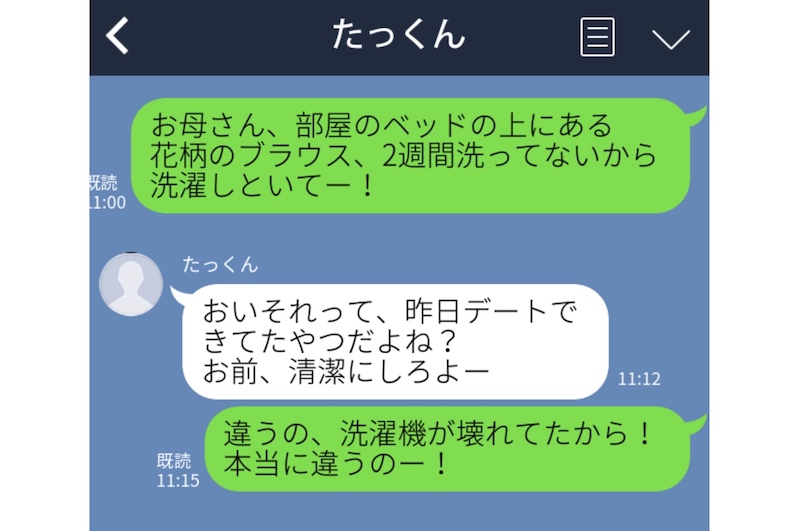 こちらの女性は、大好きな彼氏に不潔なプライベートを暴露してしまった黒歴史をもっているようです。お母さんに「ベッドの上のブラウス、2週間洗ってないから洗っといて!」と入れたLINEを、間違えて彼氏に送ってしまいました。