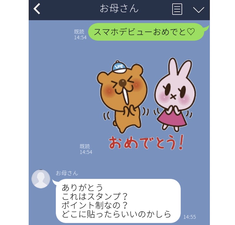こちらのLINEは、スマホデビューしたお母さんと娘のやりとり。「スマホデビューおめでとう」というメッセージと一緒にスタンプを一つ送った娘。これに対してのお母さんの返信が「このスタンプはポイント制? どこに貼ったらいいの?」というもの。