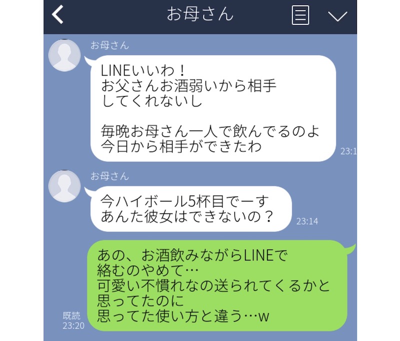 それなのに、まさかお母さんは一人でお酒を飲みながら、気楽に息子と会話できることに気づき、「ハイボール5杯目でーす」「あんた、彼女できないの?」と絡みまくり。(笑)これにはさすがの息子も、「LINEで絡むのやめて……」「思ってた使い方と違うw」と苦笑いしてしまったようです。おちゃめなお母さんですね!