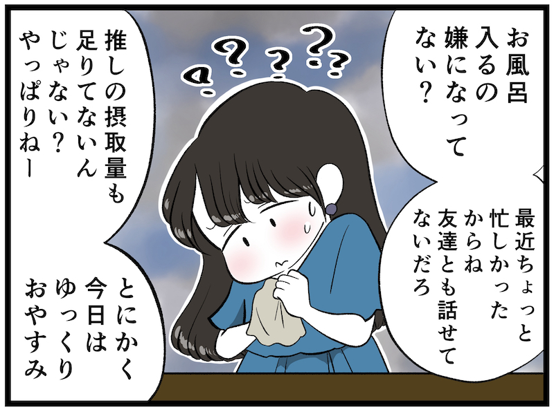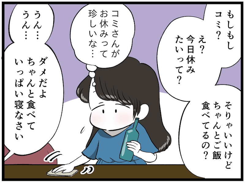 あなたは自分のことをどのくらいよく分かっているでしょうか。私はそろそろ大人歴(20歳が大人のスタート)が10年になろうかという年齢ですが、いまだに自分のことをよく分かっていません。特に疲れやストレス、メンタルのケアに関しては、分かっていても後回しにしてしまうことも……。さて、どろんぱではママがコミと何やら電話中のようです。