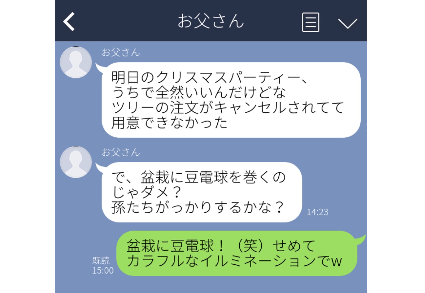 少し申し訳なさそうに、「うちの盆栽に豆電球つけるのではダメ?」と聞いてくるおじいちゃん。娘さんは「せめてイルミネーションで!」と一言(笑)健気なおじいちゃんに、思わずほっこりしてしまうLINEでした♡