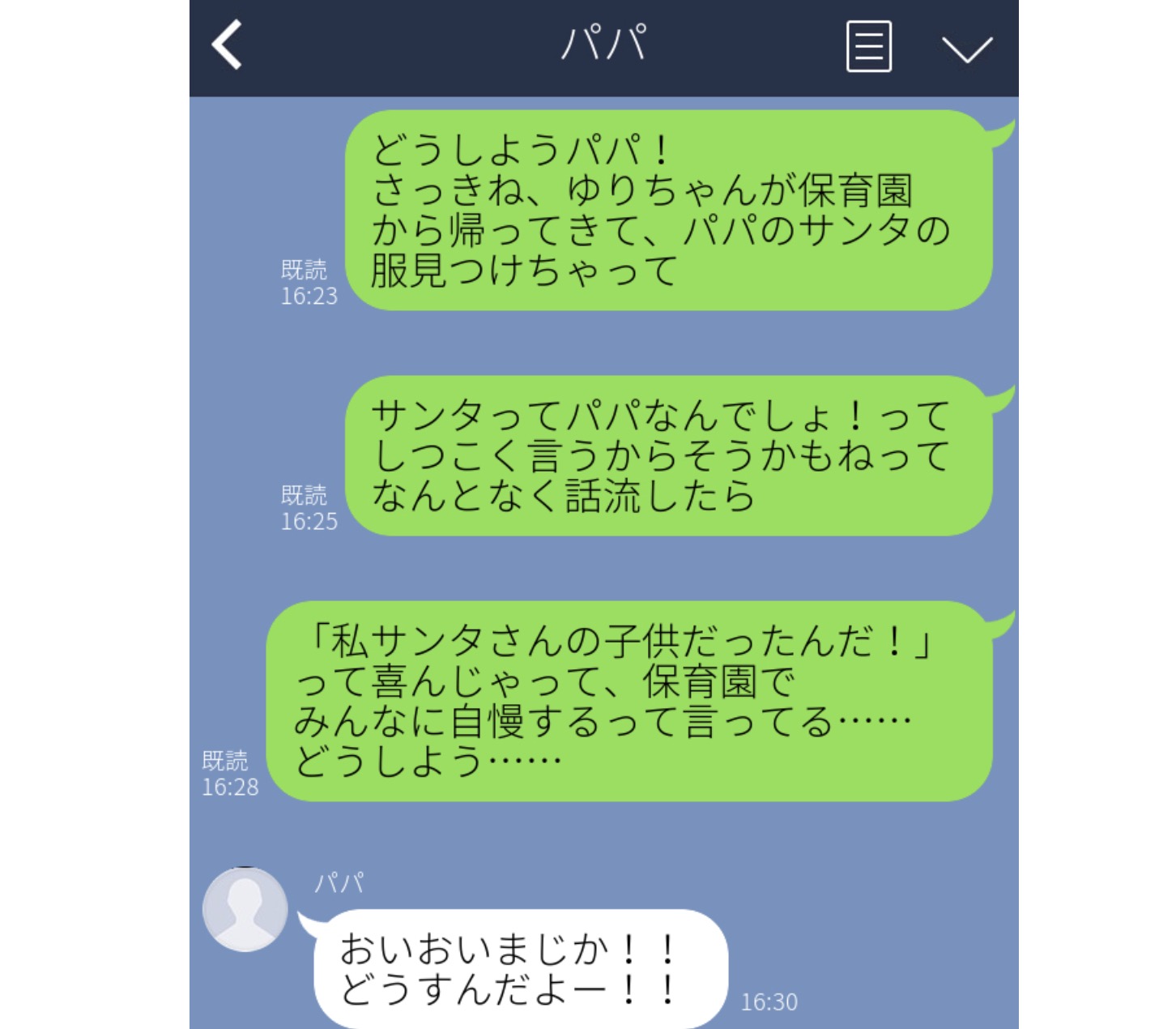 こちらの家族は、保育園に通う一人娘のために、パパがサンタの格好でパーティーを盛り上げようと準備をしていたそうです。ところが、隠していたサンタの衣装を見つけてしまった娘。「もしかして、パパがサンタなの?」と問い詰める娘に、「そうかもねー」とごまかしたところ、意外にも「私サンタの子供だったんだ!」とテンションマックスに!(笑)