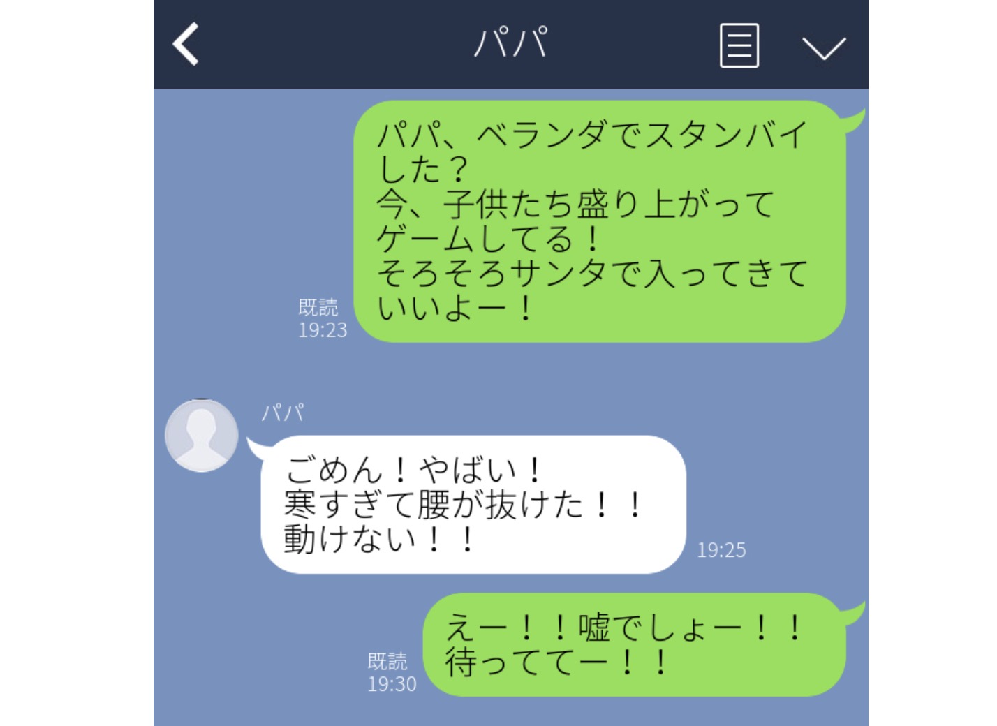 こちらのパパは、お友達を呼んで家でクリスマスパーティーをしているところに、サンタの格好で出て行って盛り上げようと、ベランダで待機していたそう。でも、残念なことに、このパパはひどい腰痛の持ち主で、寒いところで立っていたからか、なんとギックリ腰になってしまったのです!