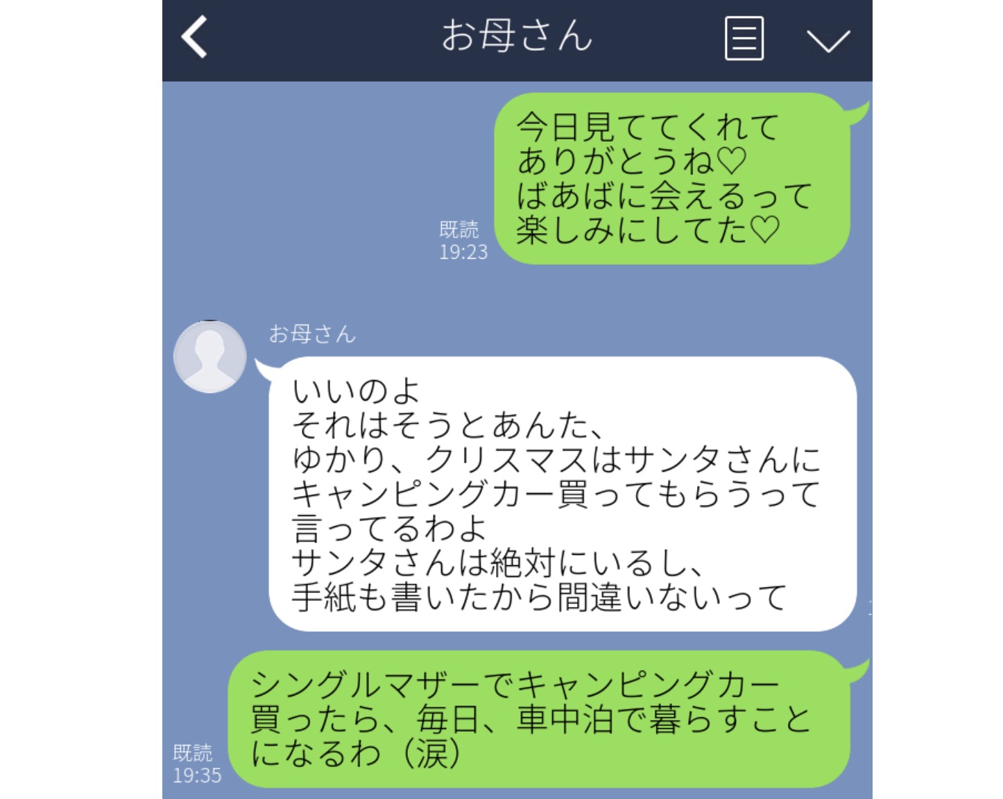 こちらは、ある日実母の家に子供を預けたシングルマザーの女性のLINE。クリスマスが近いこともあって、おばあちゃんに「クリスマスはサンタさんにキャンピングカーをもらうんだ」と話した孫。それを聞いて、慌てて娘に連絡したおばあちゃん!