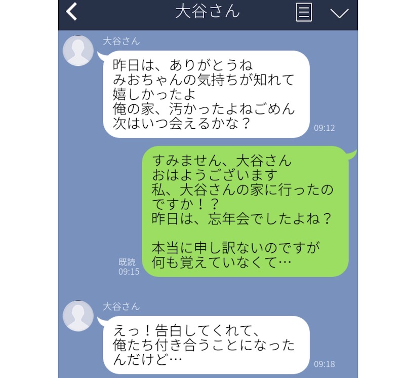 こちらも衝撃の内容です。前日の忘年会で一緒だった男性の同僚から届いたLINE。なんと、「告白してくれて付き合うことになったんだけど」というものでした。ところが、こちらの女性、まったく内容を覚えていなかったそうで「俺の家汚かったでしょ?」という部分で、何があったのかとても不安になったそう。