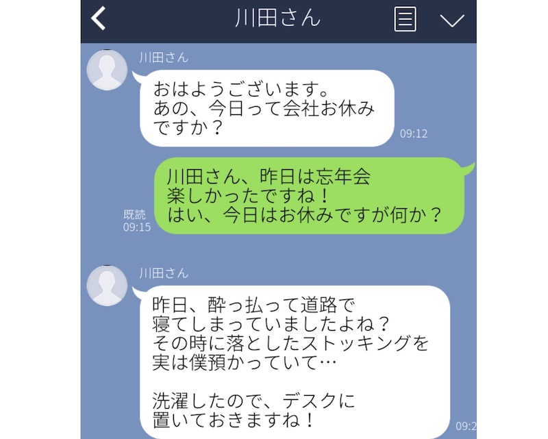 前日の忘年会を「楽しかった」と記憶していた女性に、同僚からLINEが届いたのは翌日。「酔っ払って道路で寝ていた時に落としたストッキングを預かっている」というもの。そもそも、ストッキングを落とすってどんな状況でしょう?