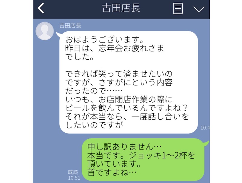 翌日、店長からLINEが入り「一度話し合いをしたい」と言われてしまいました。自分だけならまだしも、同僚の罪まで一緒に暴露してしまったので、心の底から後悔したとか。やはり、お酒を飲みすぎるといいことありませんね……。