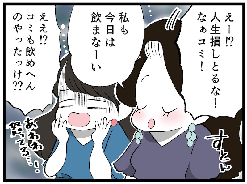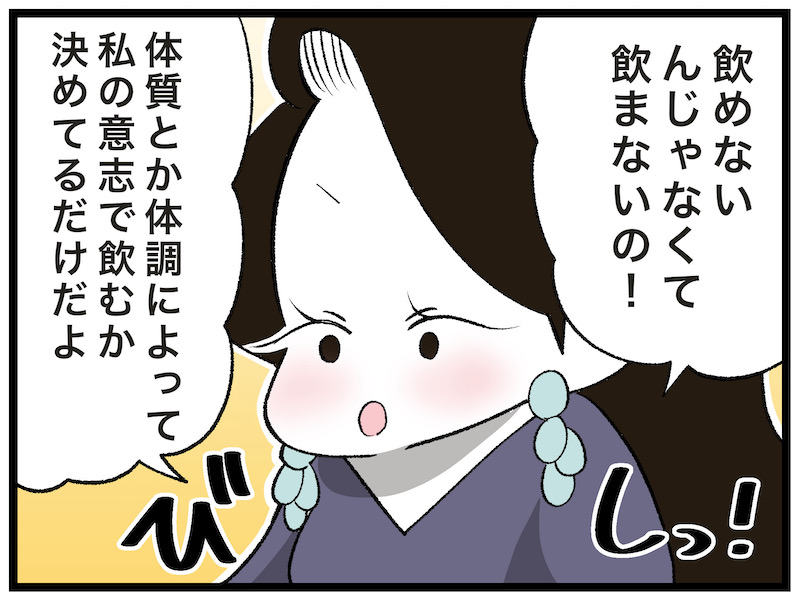 その声優さん以外はみんなお酒が好きな人たちだったので、飲まないのは彼女だけです。もし、同じ状況で私が彼女の立場なら「いやぁ、私、お酒飲めないんですよ~……すみません……」と言ってしまうと思います。なんとなく周りに合わせられなくて申し訳ない、みたいな気持ちになってしまうので「〇〇できない」という言い方になってしまうでしょう。