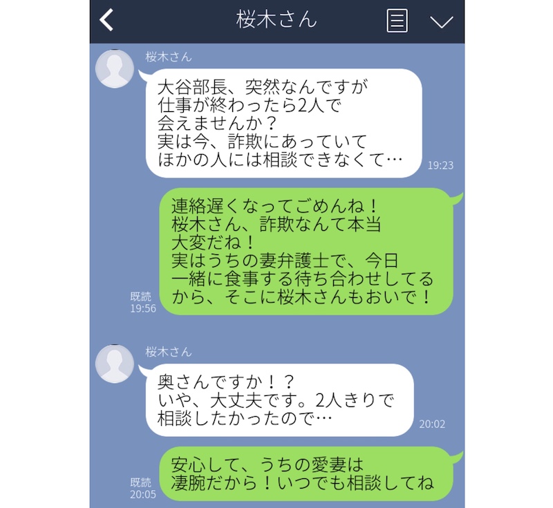こちらの男性は部下の女性社員から「実は今、詐欺にあっていて、ほかの人には相談できなくて」というLINEをもらったそう。「詐欺」という言葉を聞いて慌てた男性は、LINEを返信するまでの間に、弁護士をしている妻に相談を。