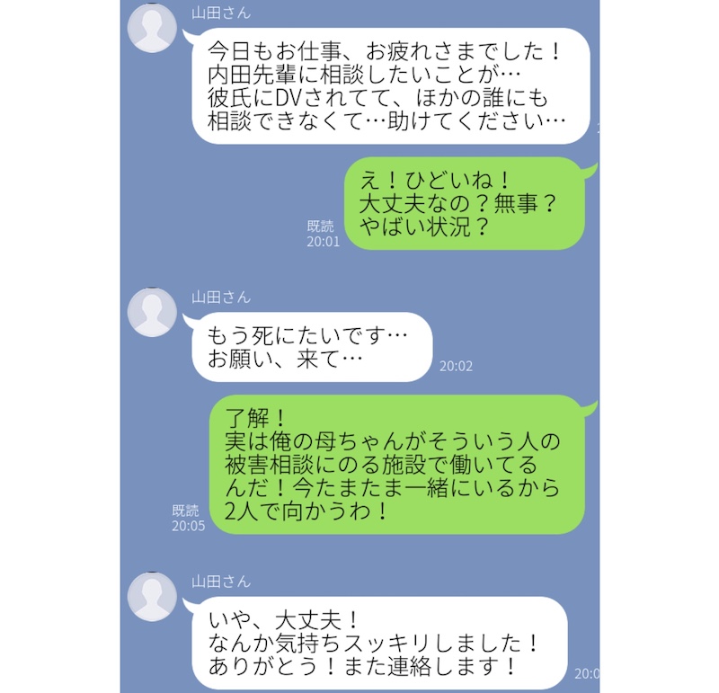 こちらの男性は、ある日、職場の後輩女性に「彼にDVをされていて、誰にも相談できない。助けてください」というLINEをもらったそう。「死にたい」という言葉もあったため、事態は緊急を要すると判断。