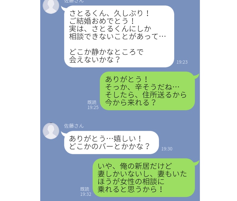 結婚したばかりのこちらの男性に、飲み会で知り合った女性から「結婚おめでとう! あなたにしか相談できない話があって、静かなところで会えない?」と連絡がきたそうです。