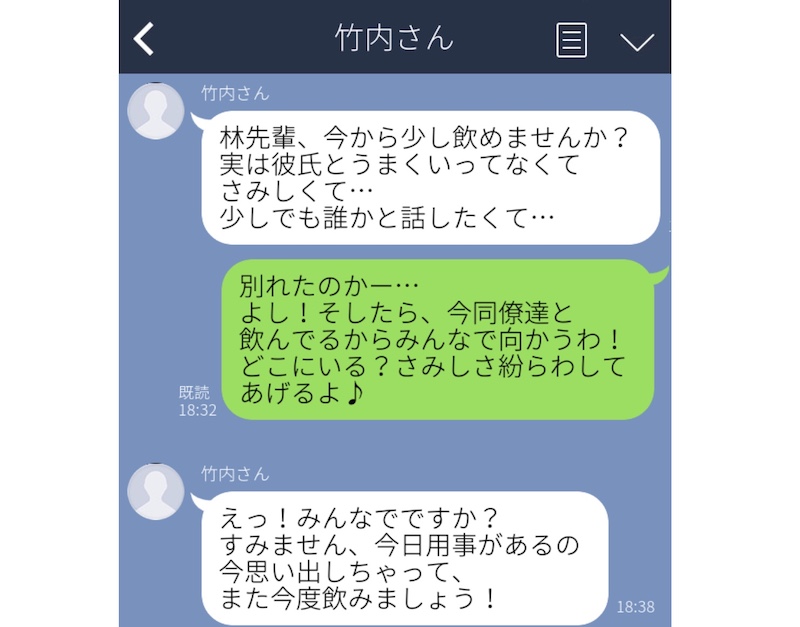 こちらの男性は、会社の同僚たちと飲み会をしているところ、同僚の女性から「今から少し飲めませんか? 彼氏とうまくいっていなくてさみしくて……」というLINEをもらいました。ちょうどみんなでいたので、「みんなで寂しさを紛らわしに向かうわ!」とLINEを入れると、「用事を思い出したのでまた今度!」との返事。
