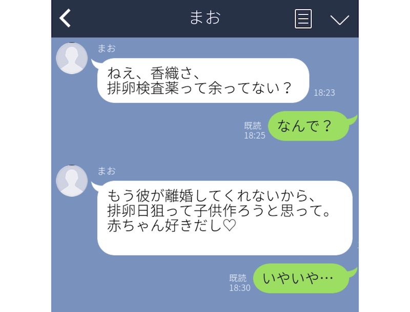 こちらのLINEも、なかなかの衝撃的な内容ですね。このLINEを送ってきた女性は、現在、妻子持ちの男性と不倫中だそう。そんな中、ある日「排卵検査薬余ってない?」というLINEが届きました。