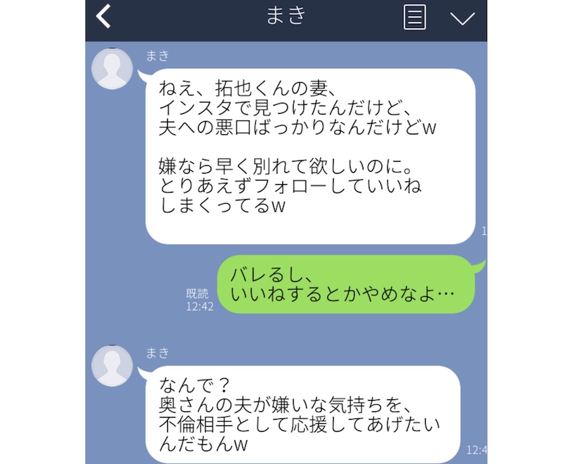 こちらの女性は、不倫中の女友達から届いたLINEにドン引きしたそうです。というのも、その友達は不倫相手の妻のSNSアカウントを見つけて、夫の愚痴を書いていることを喜ぶだけでなく、その内容に対して「いいね」をつけていたから……。