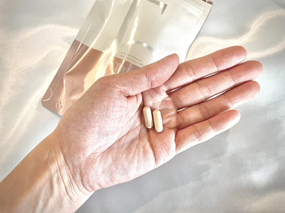 「TRIPLE ONE(トリプル・ワン)」を、さっそく開封してみました! カプセルタイプのサプリで、幅は1.8mmくらい。よく見てみると、カプセルの中には細かい粒がたくさん詰まっています。「これが美を叶えてくれる成分たち♡」と、期待がどんどん膨らみます!