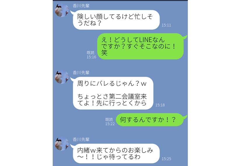 先輩はKさんの斜め前の席で、顔を上げればすぐに目が合う距離。しかし周囲には同僚も上司もいたため、LINE中は顔を上げられなかったようです。そうした中、こっそりと「第二会議室に来て」といわれてかなりドキドキしたようですね。