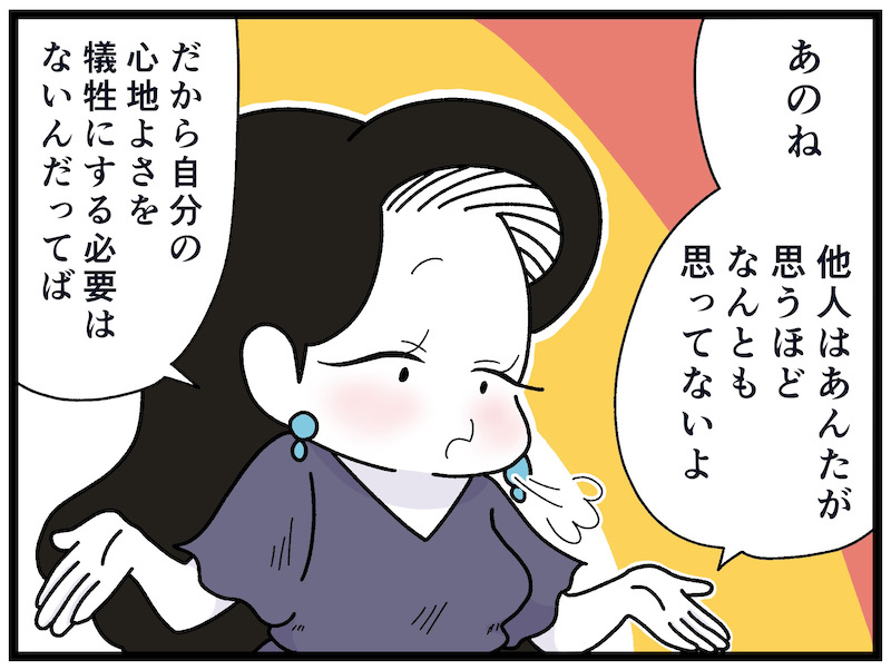 「あんたが想像するほど他人はなんとも思ってないよ」。そう言われた時、ちょっと気が楽になりました。いつもニコニコしてなくていい、いつも誰かを褒めなくていい、相手の理想にならなくていい。