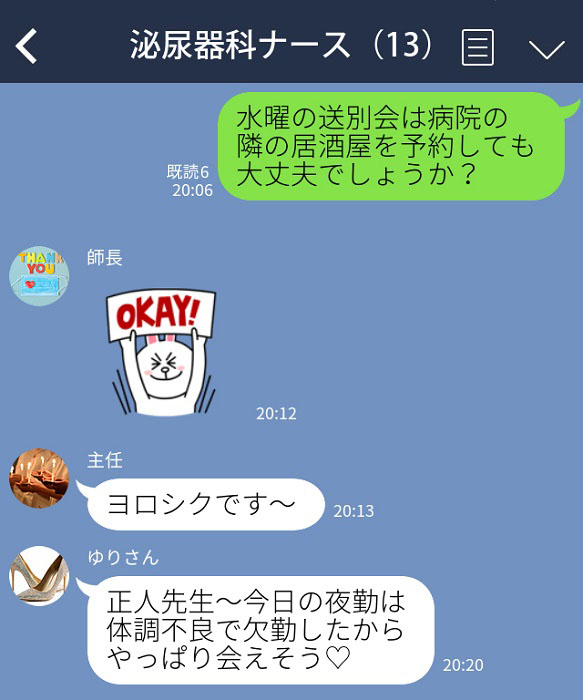 看護師として働くこちらの女性は、病棟メンバーのグループLINEで送別会の準備を進めていました。すると、その日の夜勤を欠勤した後輩から「先生、やっぱり会えそう♡」とメッセージが…。