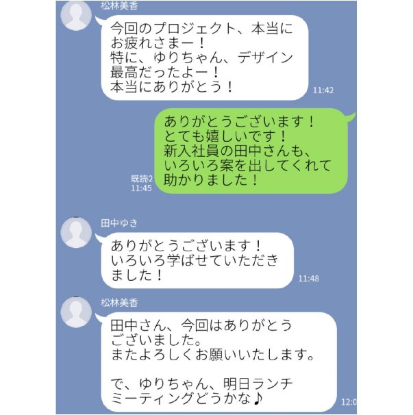 プロジェクトお疲れ様の挨拶と一緒に「特にゆりちゃん、デザイン最高だったよ!」と特定のお気に入りの女性だけを褒めていますね。