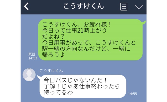 このLINEのように、仕事帰りに一緒に帰る程度のものがいいでしょう。「用事があって帰り道が一緒なんだけど、一緒に帰ろう」と誘えば自然ですね!