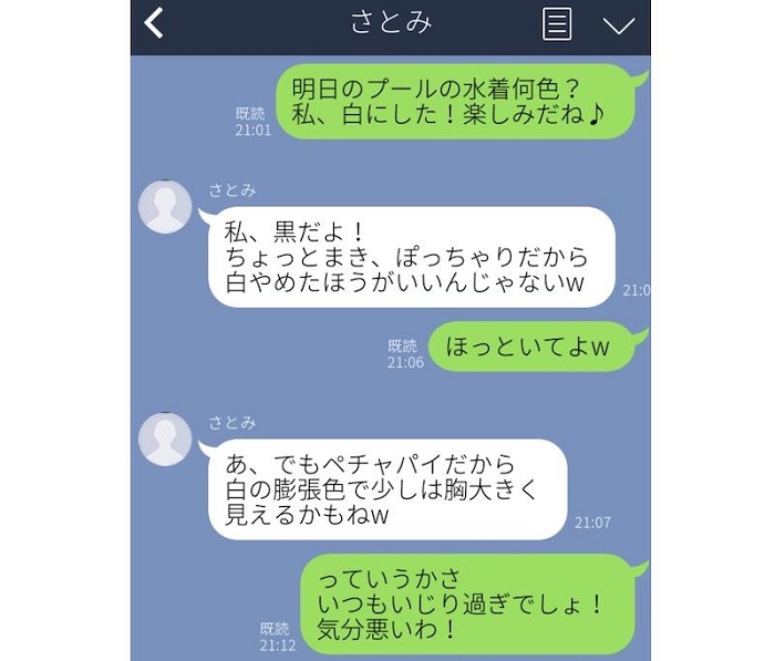 この日も「明日のプールの水着、何色にする?」と送ると、「私は黒! ぽっちゃりなんだから白はやめたら?」とに返信が届きました。