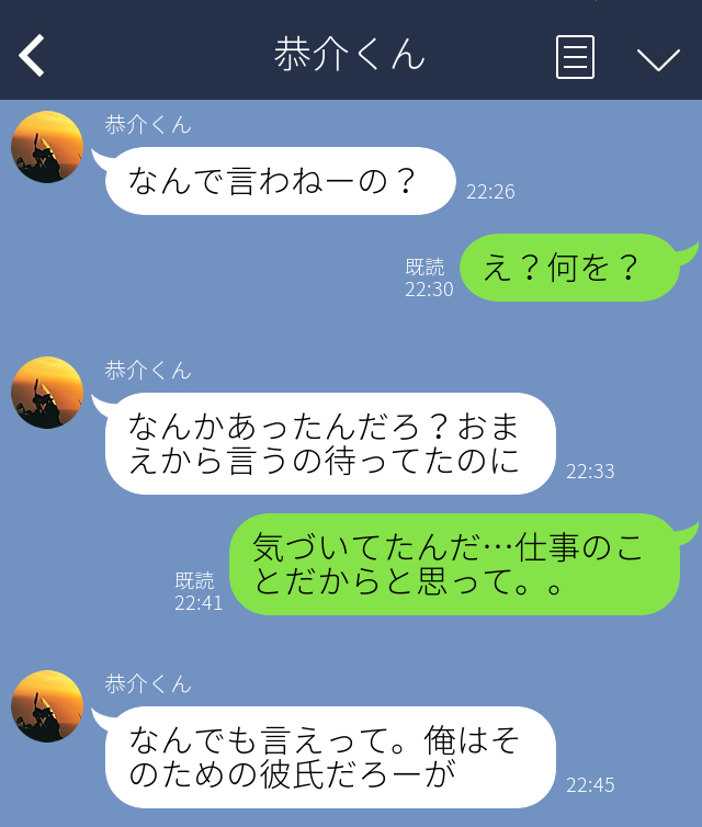 これも電話で30分くらい話したあとに届いたLINEで、私が悩んでいるのを察してくれたみたいで胸キュンしちゃいました。