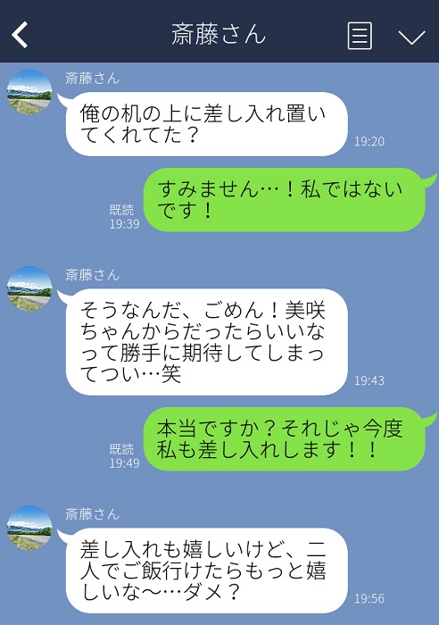その先輩が、他の女性から差し入れされたものを、私がしたものと勘違いしたみたいでLINEをしてきて。密かに『やっぱモテるんだな〜』と思っていた矢先、こんな嬉しいことを言われました。