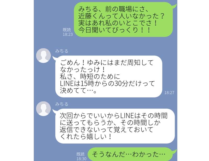 ただ「そうなんだー!」と共感して驚いてくれるかなと何気なく送っただけだったのですが、「周知してなかったね! 時短のためにLINEは15時から30分だけと決めてるから覚えておいて!」と返信が届いたそう。