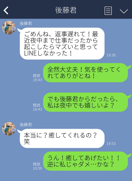 なので、私のほうからアプローチすべきかもと思って、『嬉しい』って言いながら好意を示しました。ただ、私からガツガツすべきじゃないとも思って『私じゃダメかな?』っていう健気さを添えたんです。