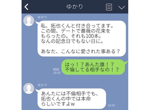 こちらの女性は、ある日突然知らない女性からLINEが届いたそうです。どうやら、夫の不倫相手で、スマホを見て宛先を調べたようでした。