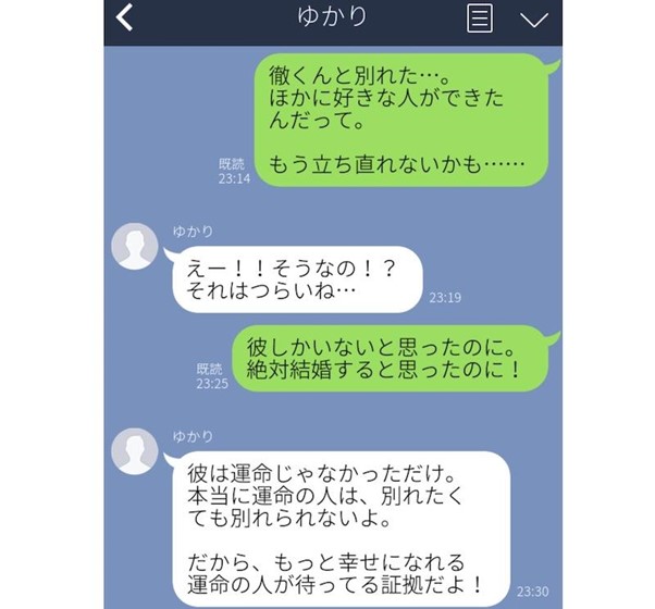 自暴自棄になり、一番仲の良い親友に報告したところ「運命じゃなかっただけ。運命の人なら別れたくても別れられないよ」と返信が届いたのです。この言葉で「もっとふさわしい素敵な運命の人がどこかにいるんだ」と信じられるようになったとか。