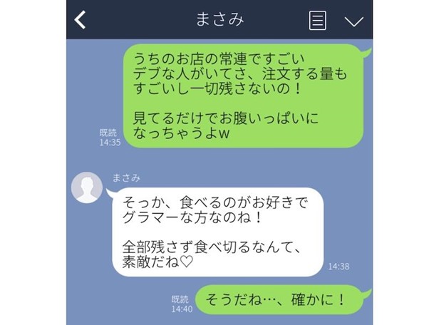 ある時、自分の働いている飲食店の話題で、「お店の常連ですごいデブな人がいて、大量に頼んで一切残さないの! 見てるだけでお腹いっぱいだよ」とLINEをしたところ「食べるのがお好きでグラマーな方なのね! 残さず食べ切るなんて素敵だね」と返ってきたのです。