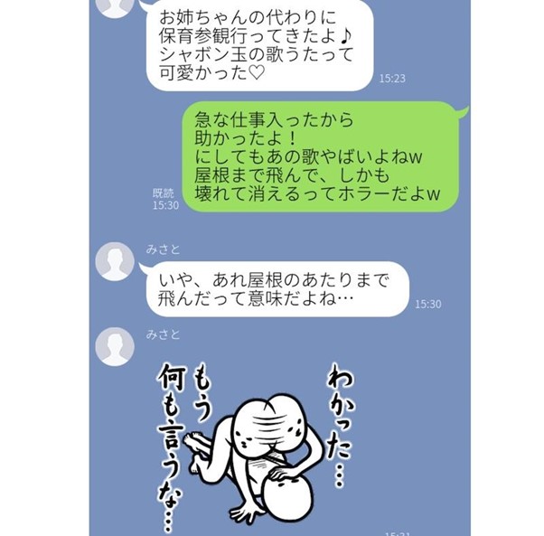 保育参観の後、LINEで「シャボン玉の歌をうたってて可愛かった♡」と入ってきたので、「あの歌やばいよね! シャボン玉と一緒に『屋根まで飛んだ』ってありえなくない? しかも壊れて消えるとかホラーだよw」と入れてしまったのです。