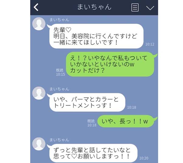 あまりに好きな感情が高まり過ぎて送ってしまったのが、「美容院に一緒に来てください」という内容。先輩からは、「なんでいかないと行けないの?」と迷惑そうにしながらも「カットだけ?」と、行く素振りを見せる返信が……。