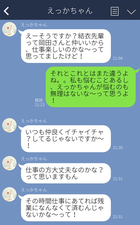 岡田くんと話してるのは休憩のタイミングだし、残業するくらいお喋りしているわけじゃないし、完全に妬まれてるな~って思いました。