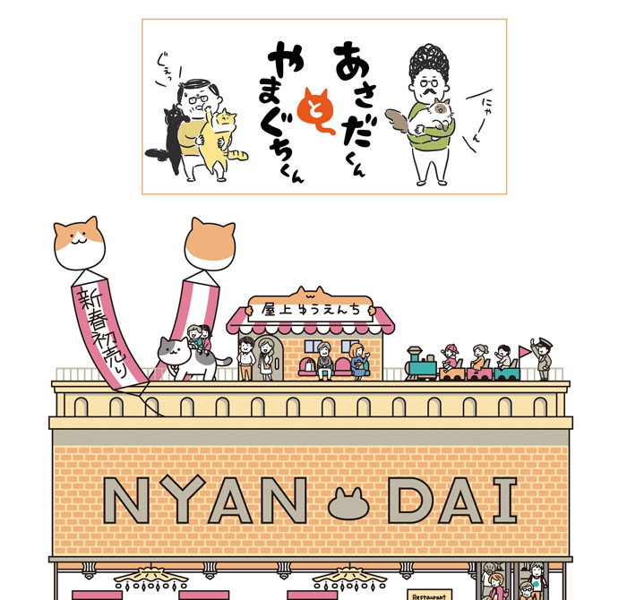 「NYANDAI」デパートでの絵のどこかに、主人公のあさだくんとやまぐちくんが1人ずつまぎれています。猫のように目を大きく見開いて見つけてね!