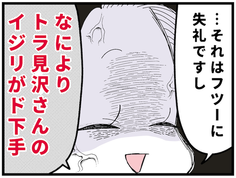 トラ見沢さん:どろんぱの常連。関西出身でちょっぴり短気。いつも眼光が鋭いので怖そうな雰囲気があるが、めちゃくちゃ涙もろく尻に敷かれやすいタイプ。主にコミが担当する。