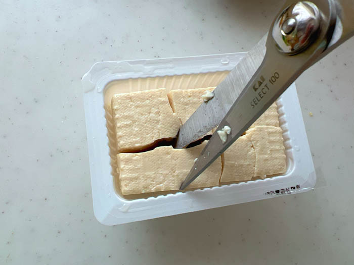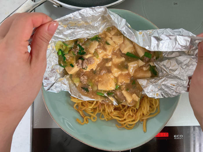 6. ホイルの中に分量の水、ひと口大に切った豆腐を入れて煮立たせる。