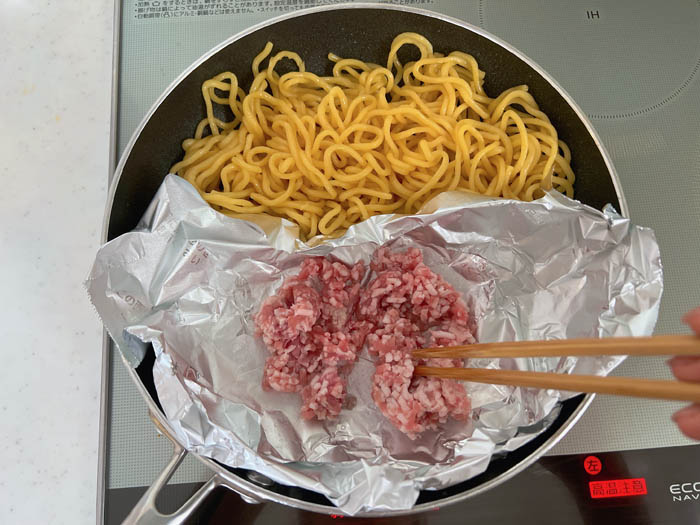 3. 麺をフライパンの半分に寄せ、空いたスペースに「フライパン用ホイル」を敷く。