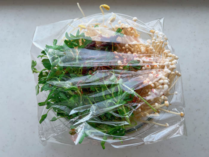 ※えのきは根元を切り落とし、食べやすい束に分ける。豆苗は根元から切り落とす。