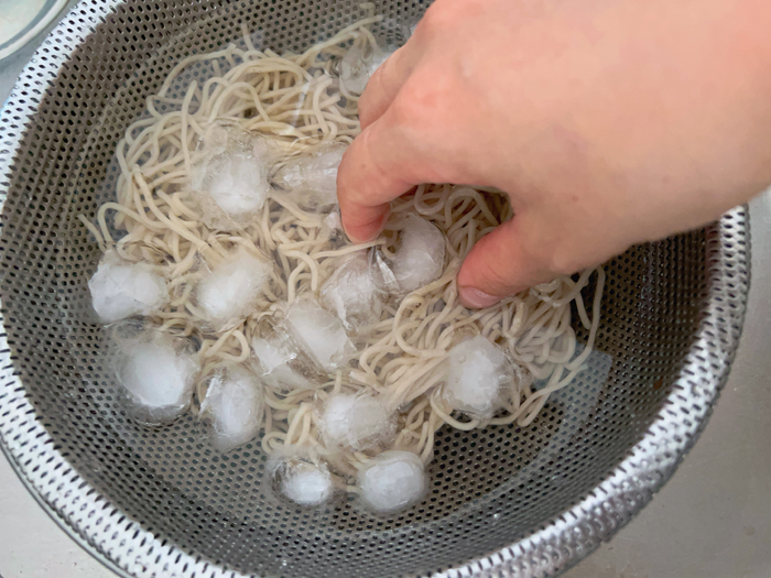 ※氷を入れたキンキンの冷水で締めながらほぐすのがポイント。時間があれば1分くらい冷水につけておくと、いっそう食感がよくなります。