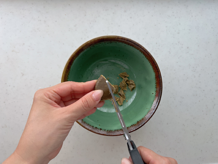 3. 耐熱どんぶりにカレールウをキッチンばさみで刻みながら入れ、冷凍ほうれん草を凍ったまま加える。