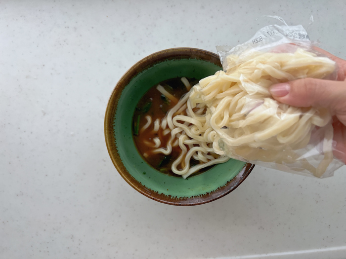 1. 冷凍うどんは袋の端を少し切って開き、電子レンジ(600W)で2分ほど加熱する(かるくほぐれていればOK)。