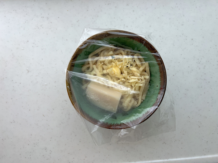 2. 餅は個包装袋から出し、耐熱皿に入れてラップをかけ、電子レンジ(600W)で20~30秒ほど加熱する(少し柔らかくなっていればOK)。