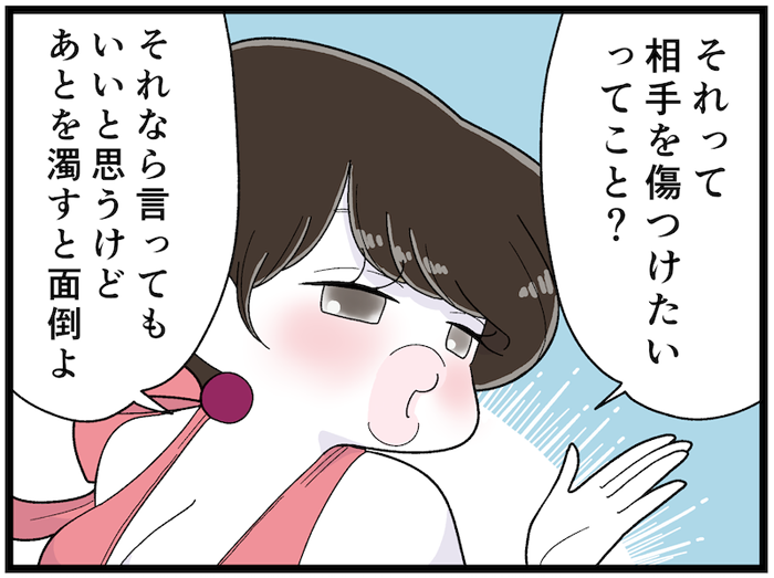 「欠点を指摘するってことは、今後も良い関係でいたいってことなの? もし言ったあと距離を置きたいって考えてるなら、それは相手を攻撃したいって気持ちになってるんじゃないか」とのこと。