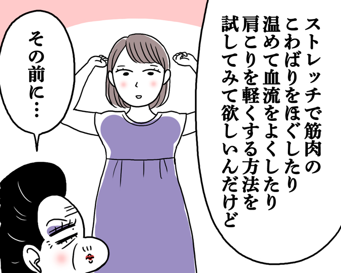 「血行不良や運動不足が原因であれば、肩をほぐすと一旦はよくなるわ。でも、姿勢や運動習慣を見直さなかったら、またすぐ肩がこってしまうわね。